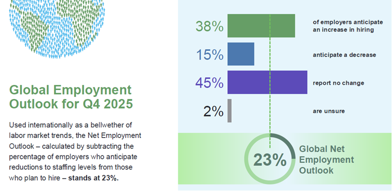 ManpowerGroupi kvartaalse uuringu raames küsitleti 40 533 tööandjat 41 riigist, et kaardistada selle aasta viimase kvartali värbamisplaane ning tööturuootuseid. Ennustatav värbamisaktiivsus on nii kvartaalses kui aastases võrdluses väikeses languses, turbulentsed muutused on kasvatanud ebakindlust, kuid vähe.
